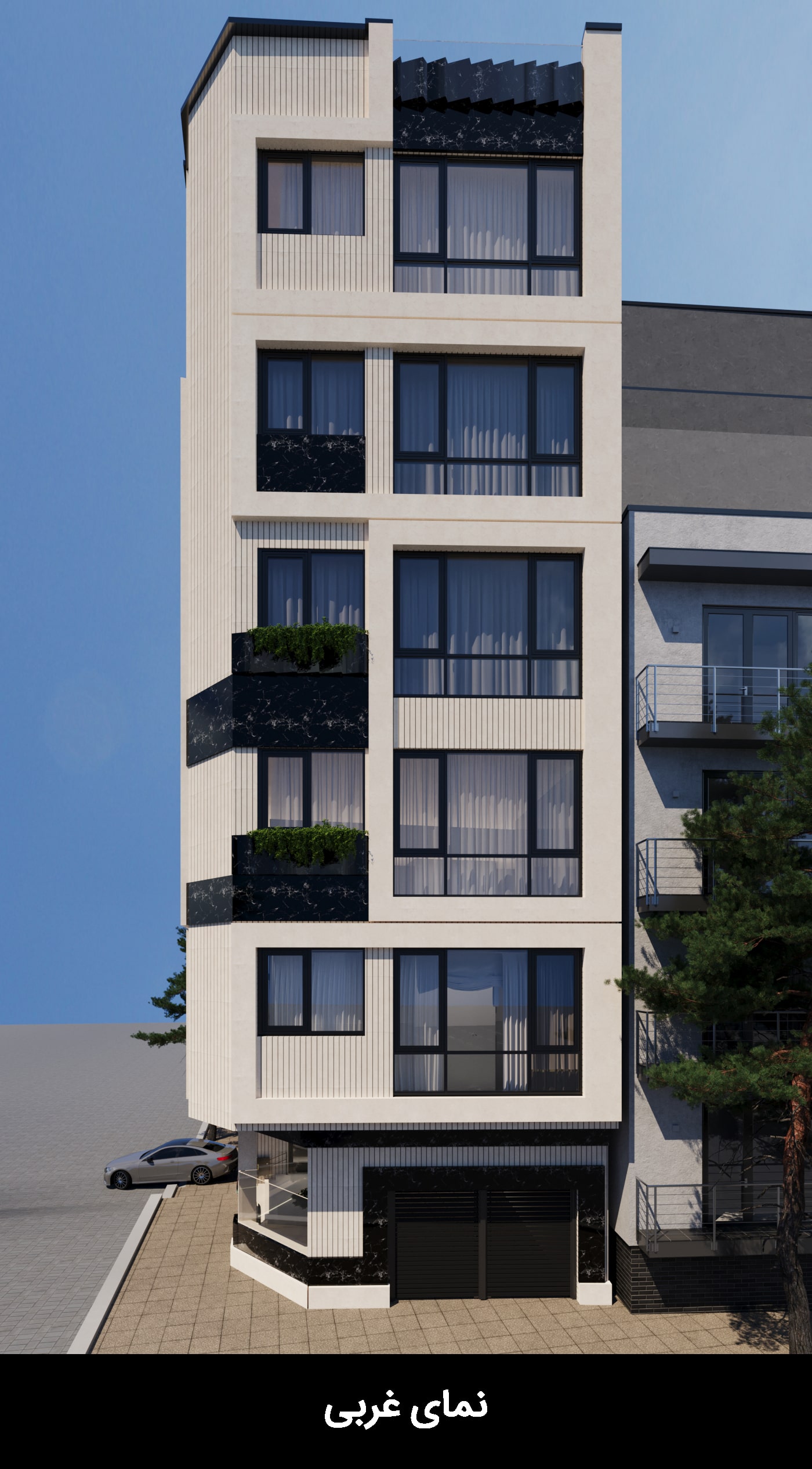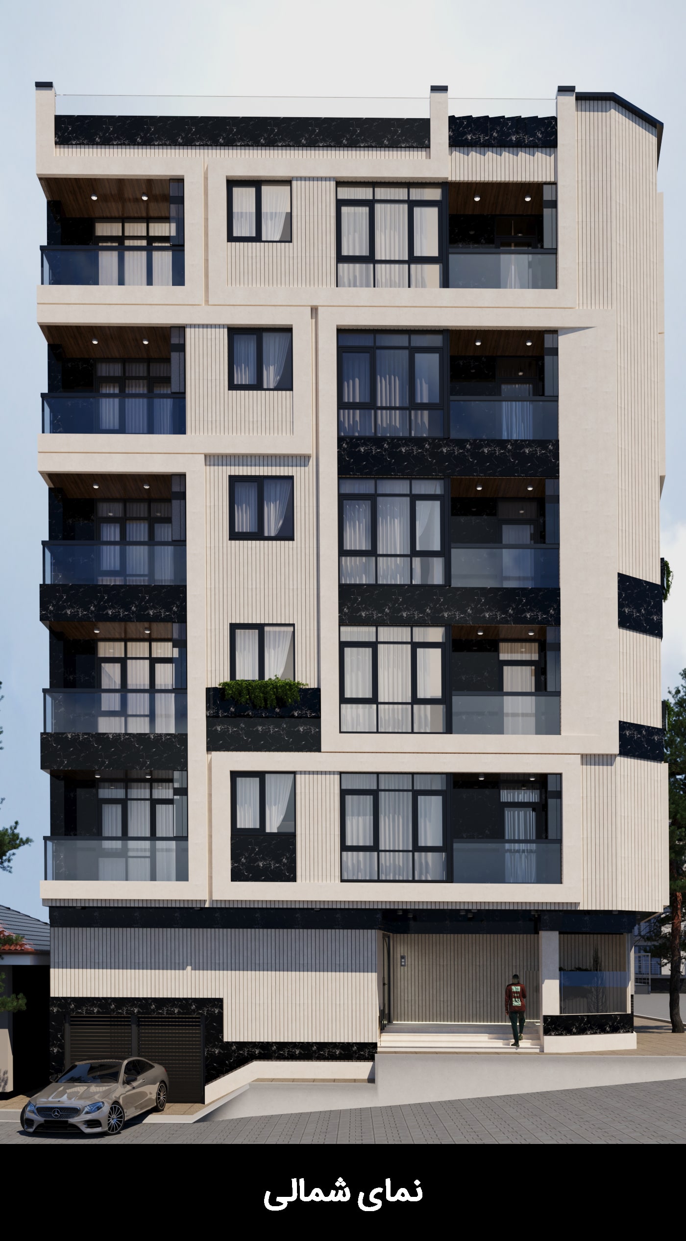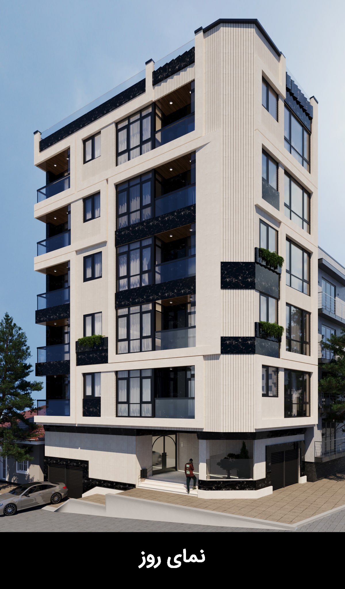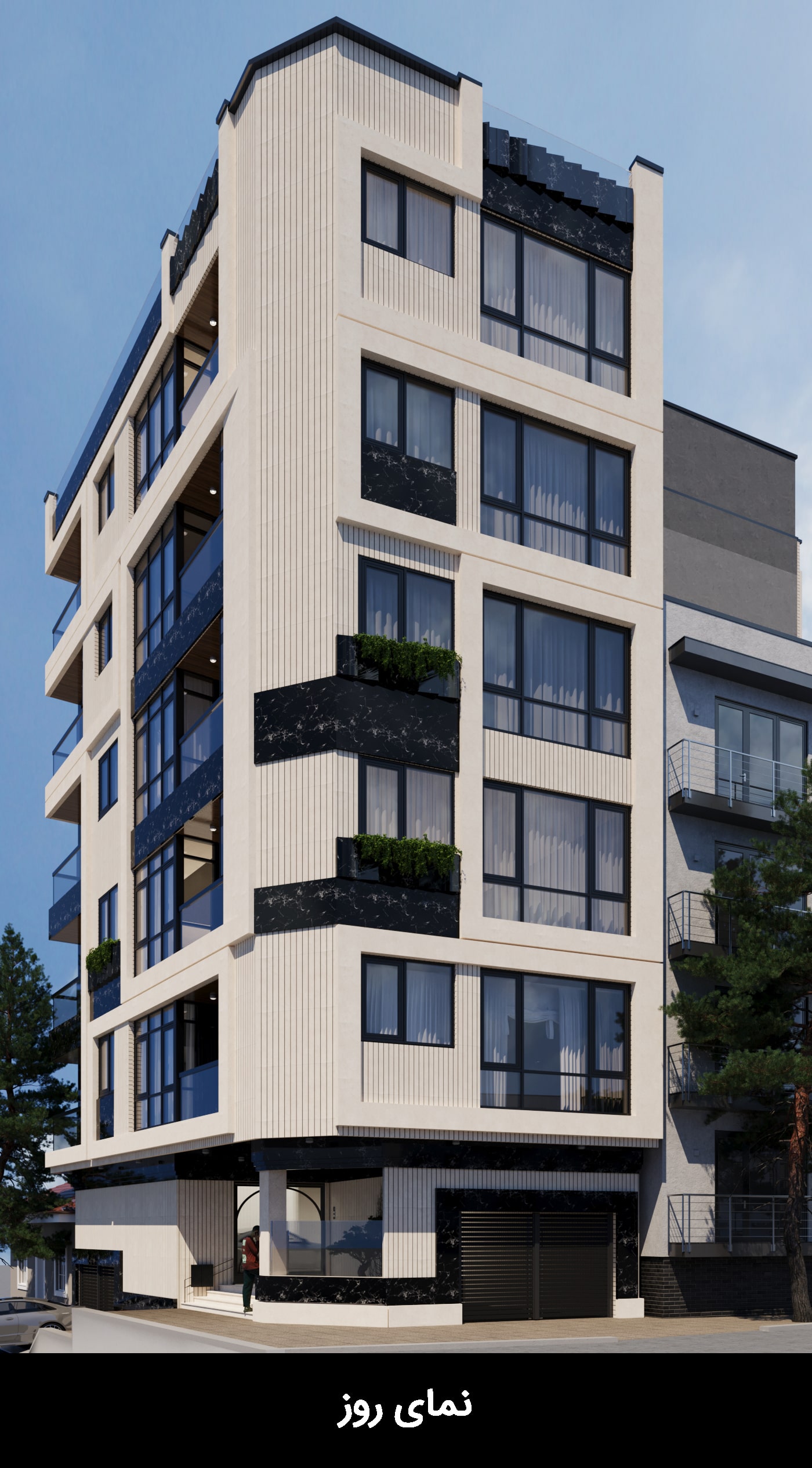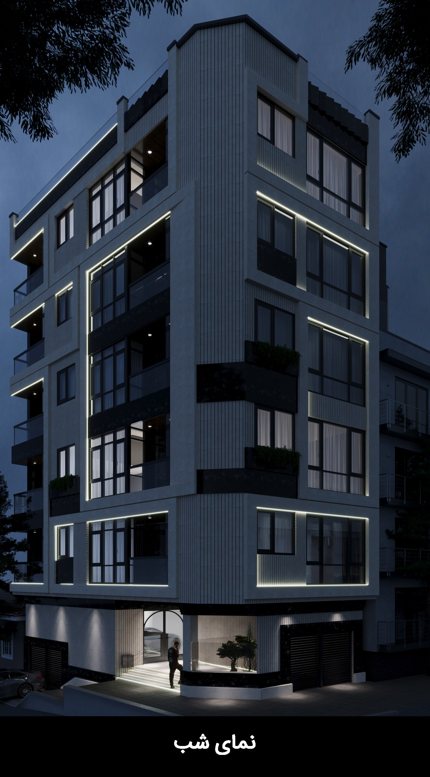 نوع پروژه: طراحی نما مکان پروژه: تهران، منطقه 1 نوع کاربری: مسکونی متراژ پروژه: 1895 متر مربع تعداد طبقات: 5 طبقه روی پیلوت، 2 طبقه منفی